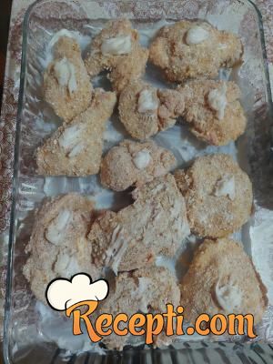 Piletinu raseći na komade. Posoliti. Pohovanje je redovno, prvo brašno, jaja i prezla. Složiti spremljeno meso u namašćenu vatrostalnu ili pleh. Na svaki komad mesa staviti po kašičicu masti.