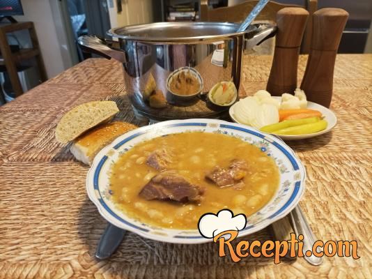 Pasulj staviti u dublju posudu, naliti hladnom vodom i ostaviti da odstoji u vodi preko noći. Narednog dana procediti pasulj, naliti ga sa novom vodom i staviti da provri. Kada pasulj provri, ponovo ga procediti, isprati pod mlazom tople vode i sada je spreman za dalje kuvanje. Crni luk, šargarepu i koren celera staviti u secko i sitno iseckati. Čen belog luka oljuštiti i samo preseći na pola.