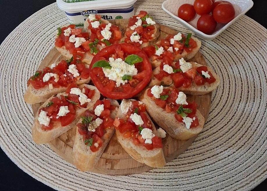 Iseckati paradajz na kockice, dodati kašiku maslinovog ulja i izmešati. Izdrobiti sir i sitno naseckati listiće bosiljka. Na baget složiti kockice paradajza, pa dodati sir i posuti seckanim bosiljkom.
