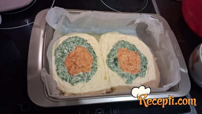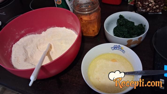 U brašno sipati sir i jaja i izmešati. Dodavati jogurt i mešati dok se ne postigne željena gustina smese. Potrebno je oko 500 ml gustog jogurta. Odvojiti dve četvrtine smese i u jednu dodati spanać i malo bibera, a u drugu ajvar i alevu papriku. Polovinu smese ostaviti svetlu.
