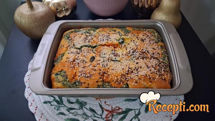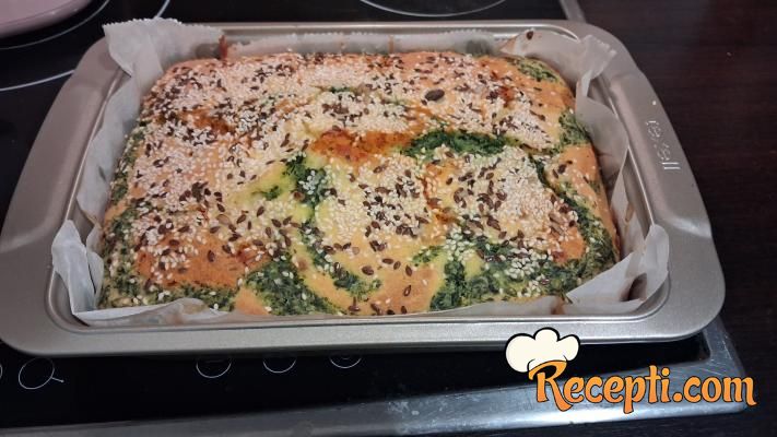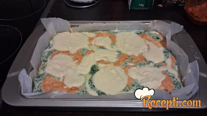 Tepsiju, dimenzija 22x32 cm, obložiti pek papirom i premazati ga jednom kašikom ulja. Kutlačom sipati belu smesu na dva mesta, pa u sredinu sipati smesu sa spanaćem, a preko smesu sa ajvarom.