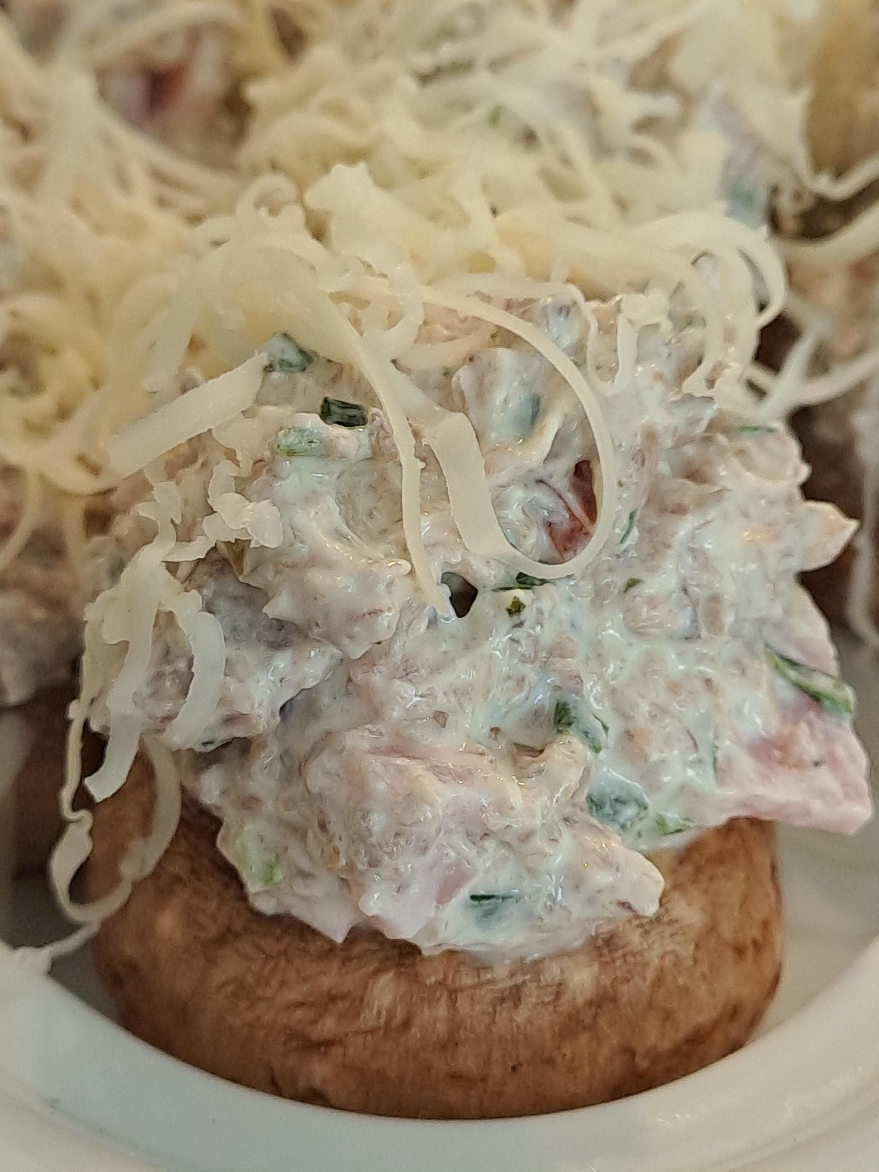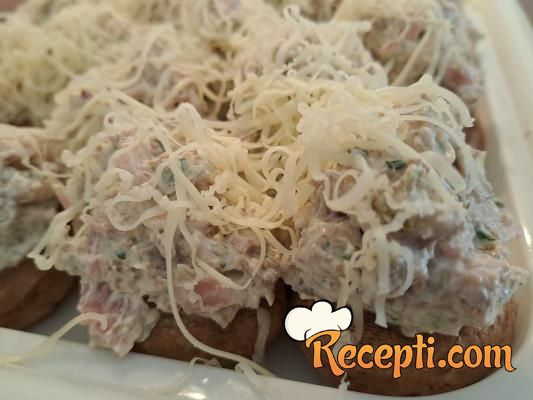 U ohlađeno dodati sitno iseckan suvi vrat, pavlaku, majonez, krem sir i sitno seckani krastavčić, pa sve izmešati. Napuniti kapice, pa ih posuti rendanim kačkavaljem.
