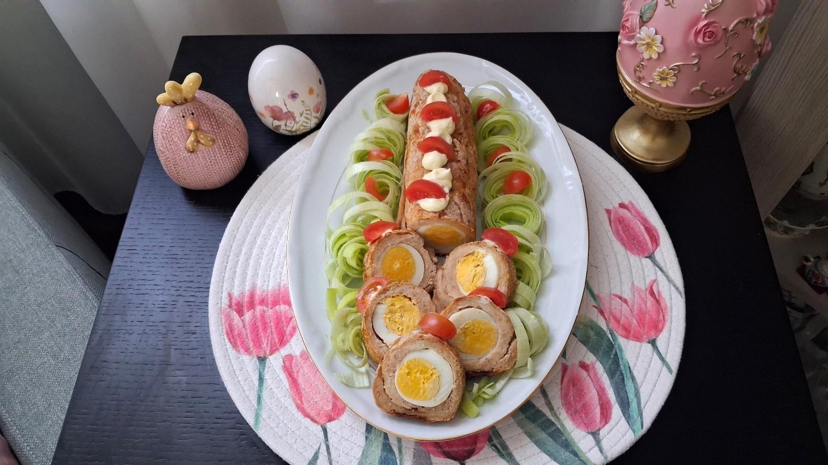 Po jednoj ivici rasporediti kuvana jaja. Da bi stajala pravo, najbolje ih je poređati u struku većeg praziluka, koji možete da ostavite da se ispeče u rolatu, ili da ga lagano izvučete pre zamotavanja mesa.