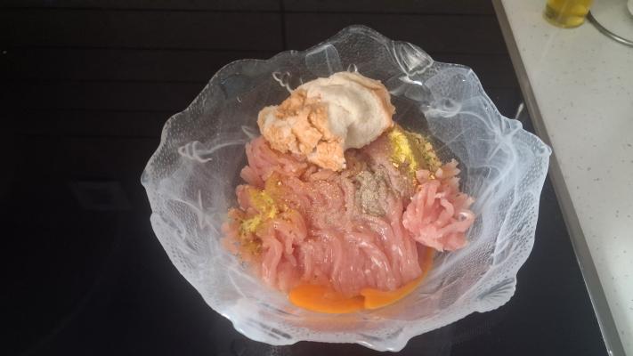 U činiju staviti sitno mleveno meso, začine, jedno jaje i kašiku ulja (nije potrebno, ako koristite svinjsko meso). Krišku hleba potopiti u vodu, ocediti i dodati ostalim sastojcima.
