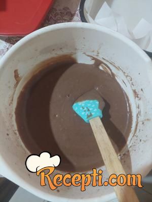 Brašno pomešati sa kakaom, solju i praškom za pecivo. U posebnoj činiji izmutiti jaja sa šećerom i vanil šećerom. Dodati otopljen margarin i mleko.