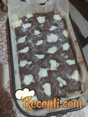 Kakao smesu izliti u pleh veličine 25×30 cm prethodno obložen pek papirom. Kokos smesu kašikom ređati na kakao smesu, da budu tufne.