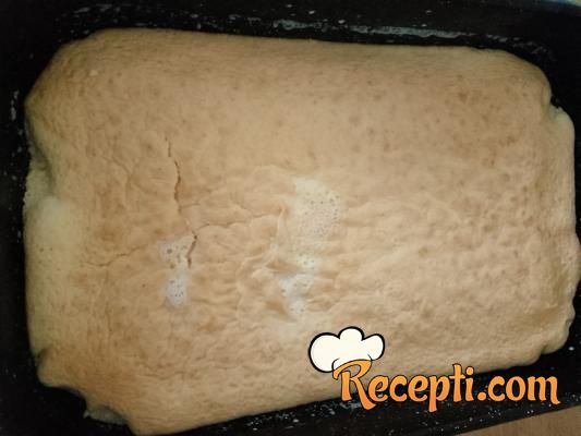 Jaja umutiti penasto sa šećerom, dodati brašno, prašak za pecivo i vanil šećer, sve lepo sjediniti i sipati u pleh obložen pek papirom. Peći na 200 C, oko 15 minuta.