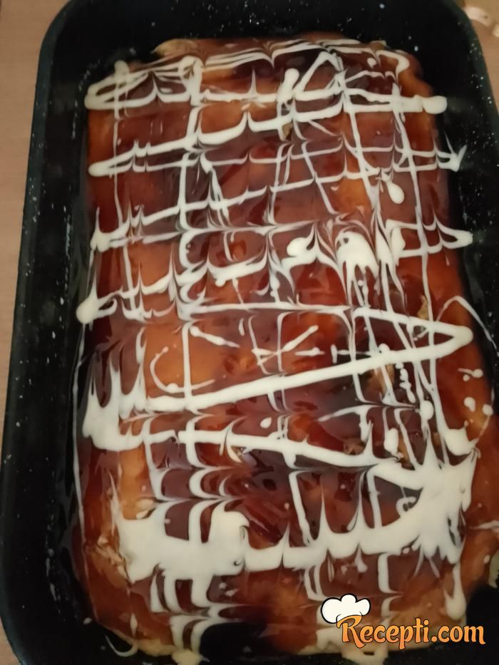 Pomešati 800 ml mleka sa 500 ml slatke pavlake. Koru staviti u dublji pleh i preliti sa mlekom.