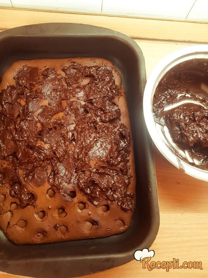 Preko ohladjenog kolača premažite šlag koji ste pripremili po uputstvu na ambalaži.