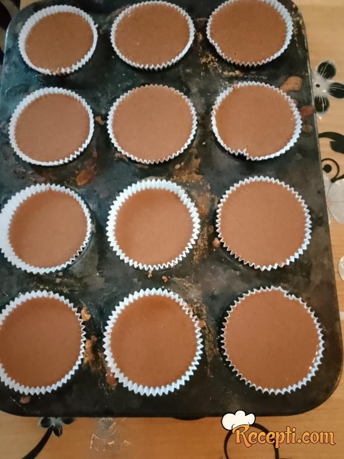 U kalup za mafine staviti korpice za mafine papirne, sipati smesu u korpice i u svaku staviti po kockicu crne čokolade.