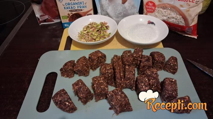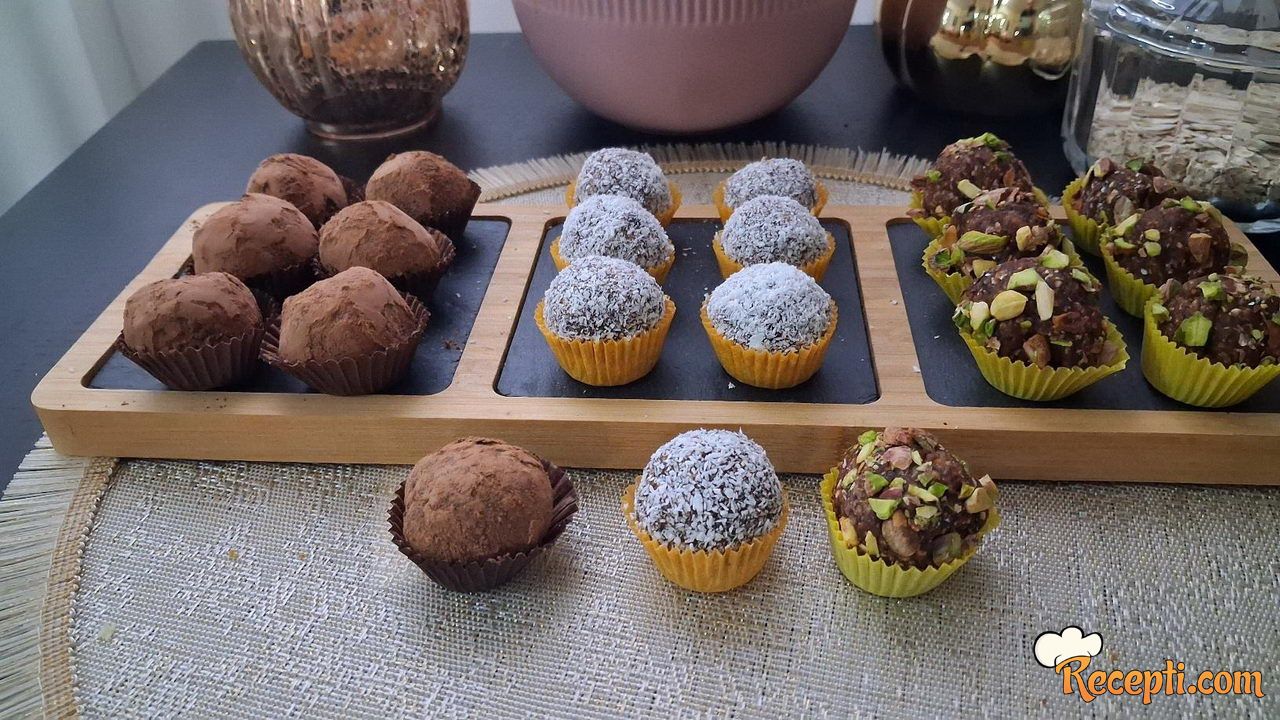 Oblikovati kuglice i uvaljati ih u orašaste plodove, kokos ili jednostavno samo u kakao. Bilo koju oblogu da odaberete ukus je izuzetno lep.