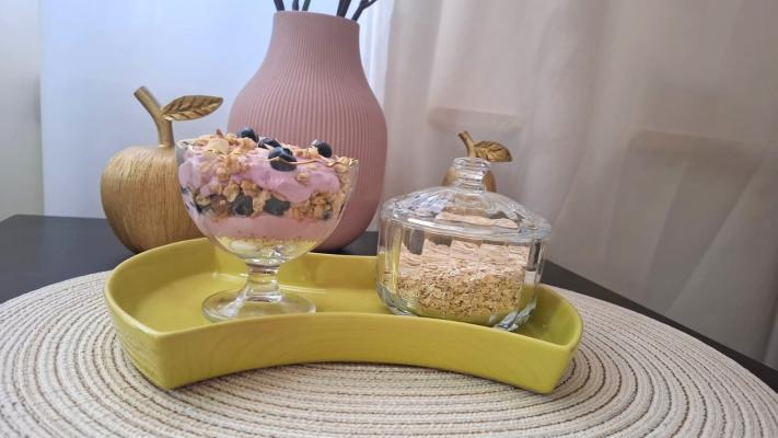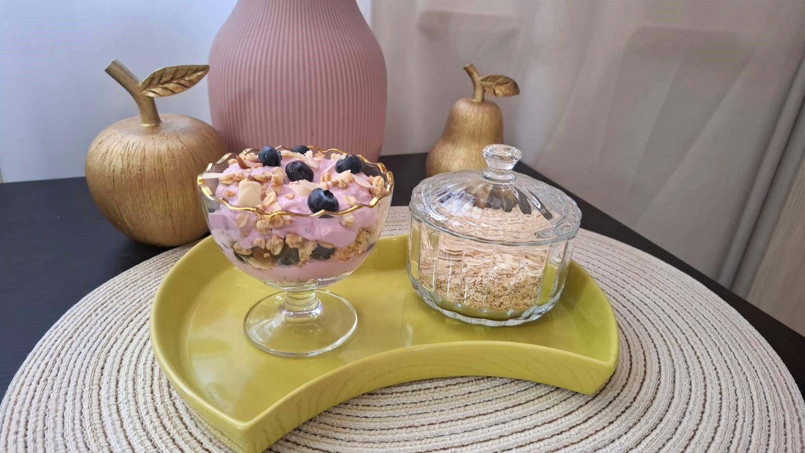 U široku čašu sipati ovsene pahuljice i preko njih pola količine jogurta. Posuti borovnicama i sa dve kašike krispija. Preko krispija sipati drugu polovinu jogurta, pa preko opet dodati krispi i dekorisati sa nekoliko borovnica i listićima blanširanog badema. Ukus je neodoljiv. Pojede se za tren oka!