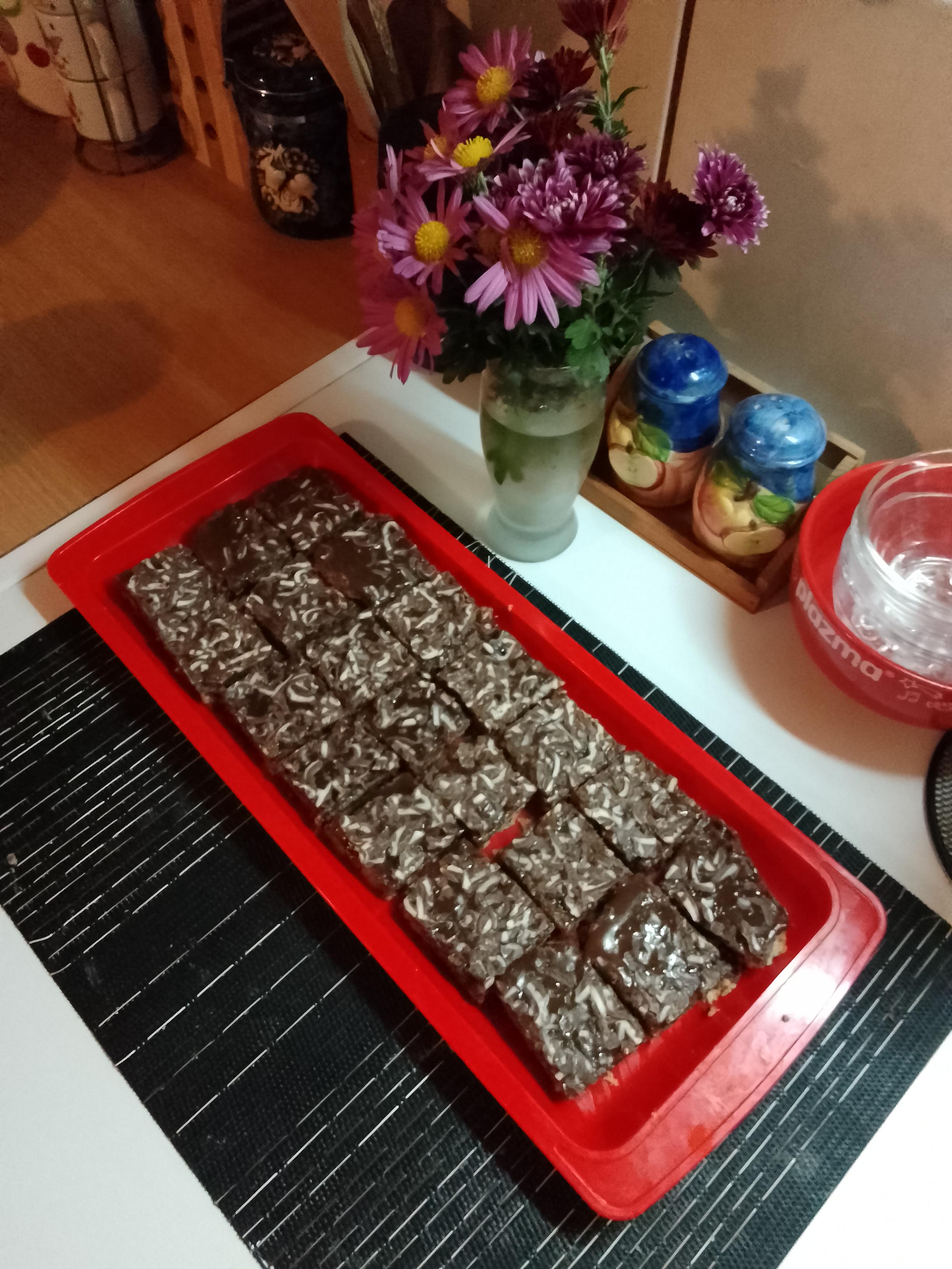Belanca umutiti sa šećerom u čvrst sneg, dodati brašno, prašak za pecivo, ulje i rendanu crnu čokoladu. Sve lepo sjediniti izliti u pleh podmazan i pobrašavljen. Peći na temperaturi od 200 stepeni oko 15 minuta.