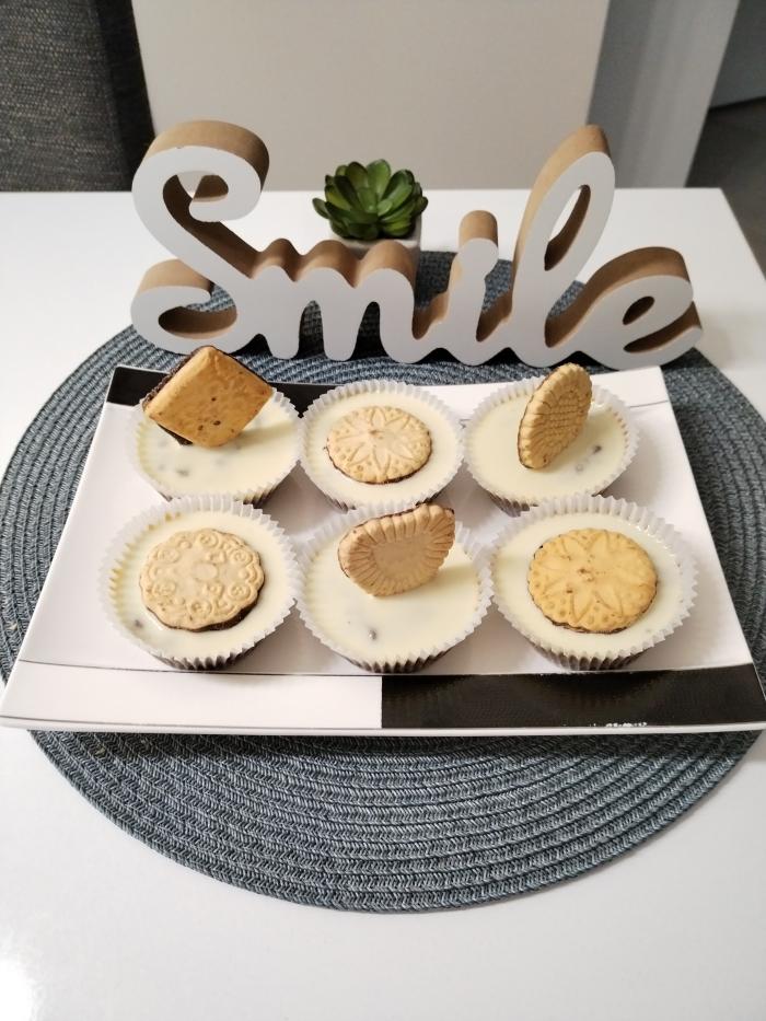 Za glazuru otopite belu čokoladu sa uljem i prelijte korpice.