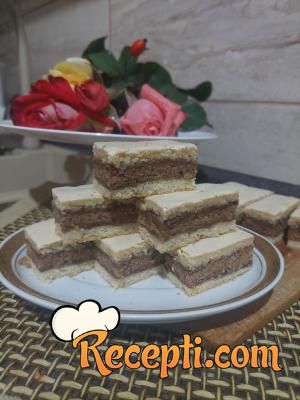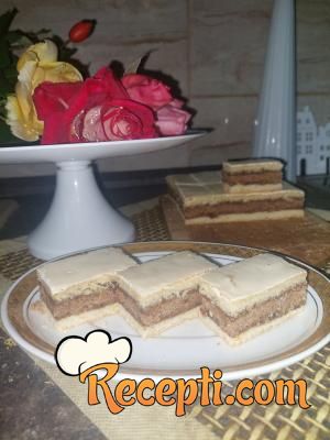 Razviti jednu svetlu koru i staviti u podmazan kalup. Testo premazati sa dve kašike pekmeza i posuti sa pola količine smese od oraha. Na to razviti kakao koru. Ponovo mazati sa dve kašike pekmeza, posuti drugom polovinom mlevenih oraha. Na to staviti razvijenu svetlu koru. Izbockati viljuškom.