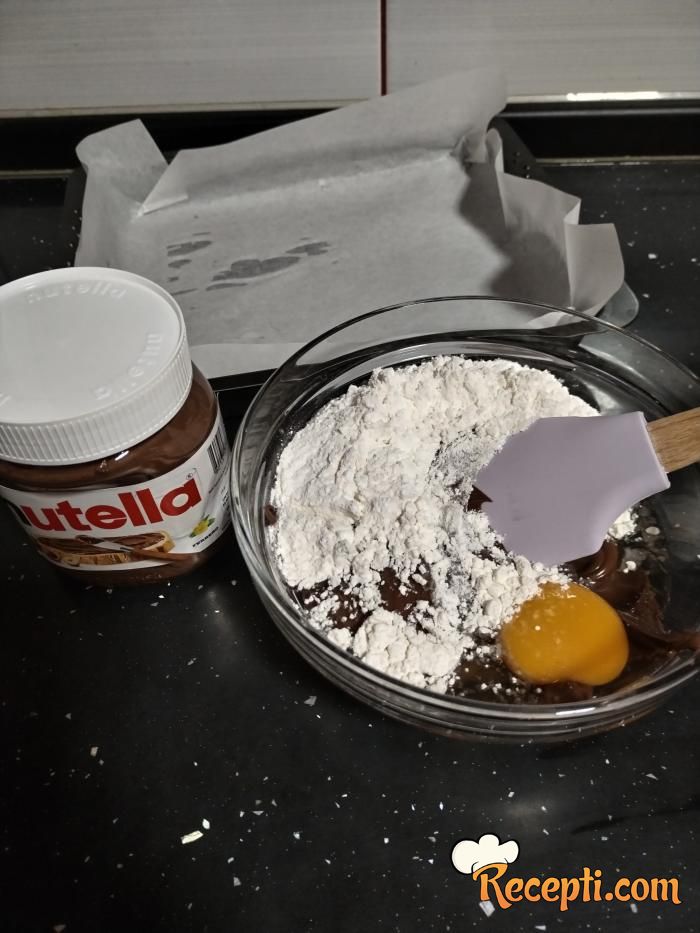 Za pripremu brauni kore: U sud sipajte nutellu, jaja i brašno i sve sastojke sjedinite. Promešajte da se smesa ujednači.