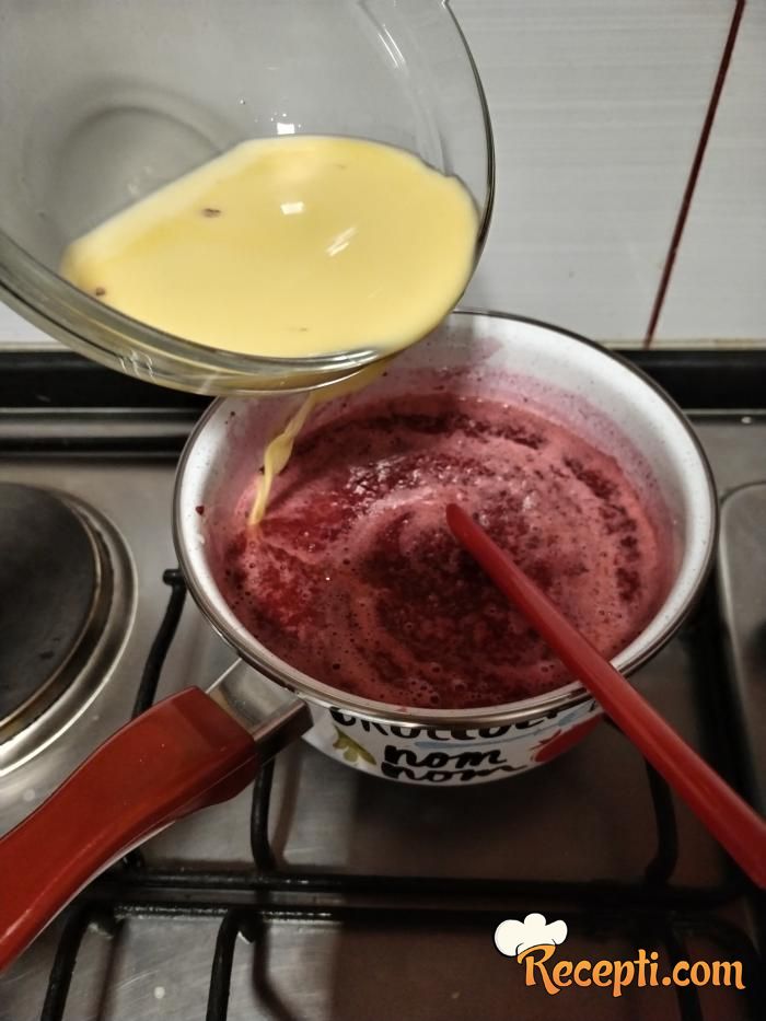 Sjedinite 100 ml vode i prašak za puding da nema grudvica. Sipajte u maline i kuvajte dok se ne zgusne.