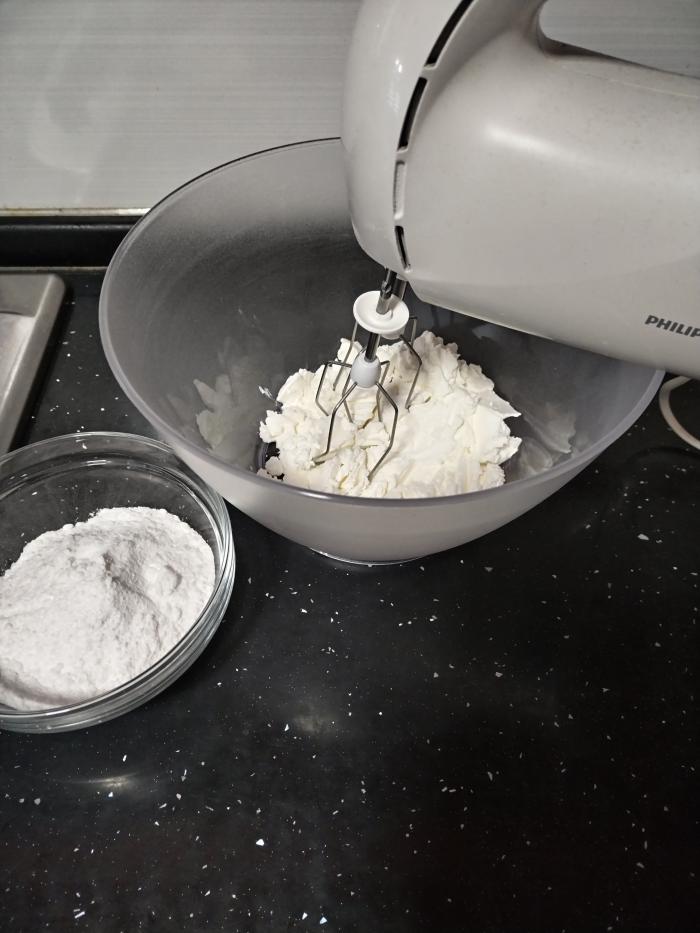 U dublji sud umutite omekšali krem sir dok ne postane gladak i kremast. Dodajte šećer u prahu i aromu vanile, pa mešajte dok se potpuno ne sjedine.