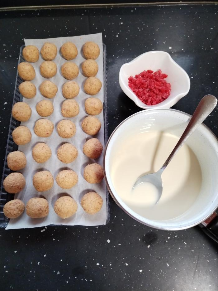 Kada se ohlade, istopite preostale komadiće bele čokolade. Umočite svaku kuglicu u otopljenu belu čokoladu pazeći da je potpuno obložena. Vratite ih na papir da se stegnu.
