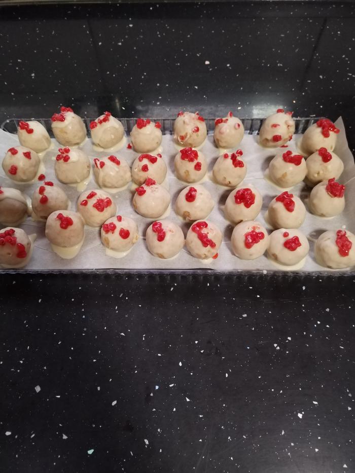 Za dodatni ukus, svaku kuglicu pospite svežom malinom i prelijte dodatnom otopljenom belom čokoladom. Ohladite kuglice najmanje 30 minuta pre serviranja.