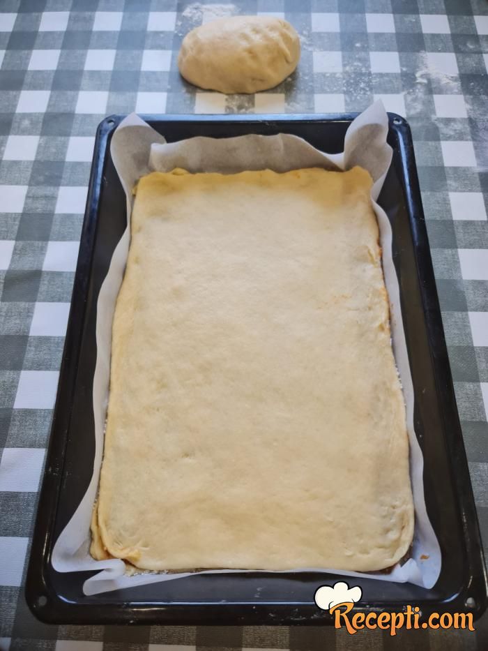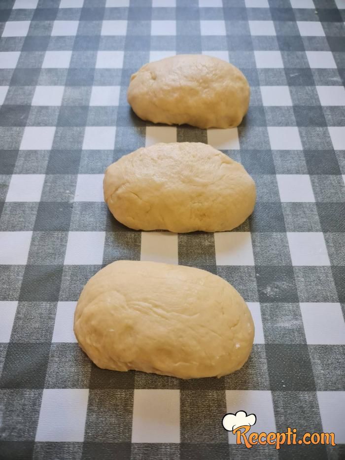 U mlako mleko stavite kvasac i kašičicu šećera i ostavite da nadođe. U nadošli kvasac dodajte brašno, mast, jaje i zamesite testo.