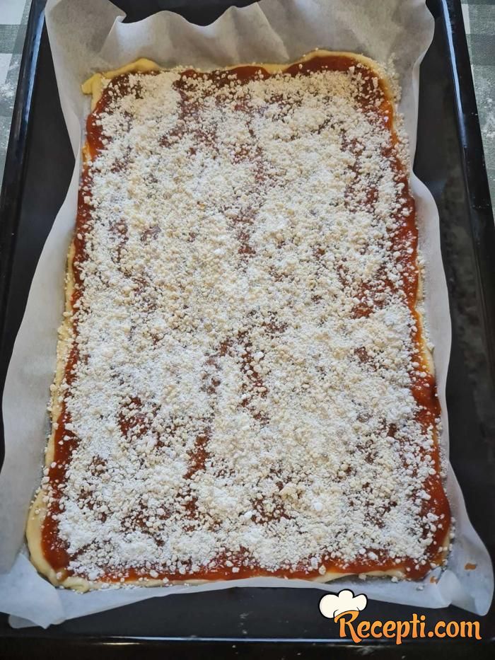 Razvucite i drugi deo testa pa prebacite preko fila. Premažite ga pekmezom od kajsija, preko pospite ostatkom fila. Razvijte i treći deo testa pa prebacite u pleh.Pecite u prethodno zagrejanoj rerni na 200 stepeni oko 30-40 minuta.