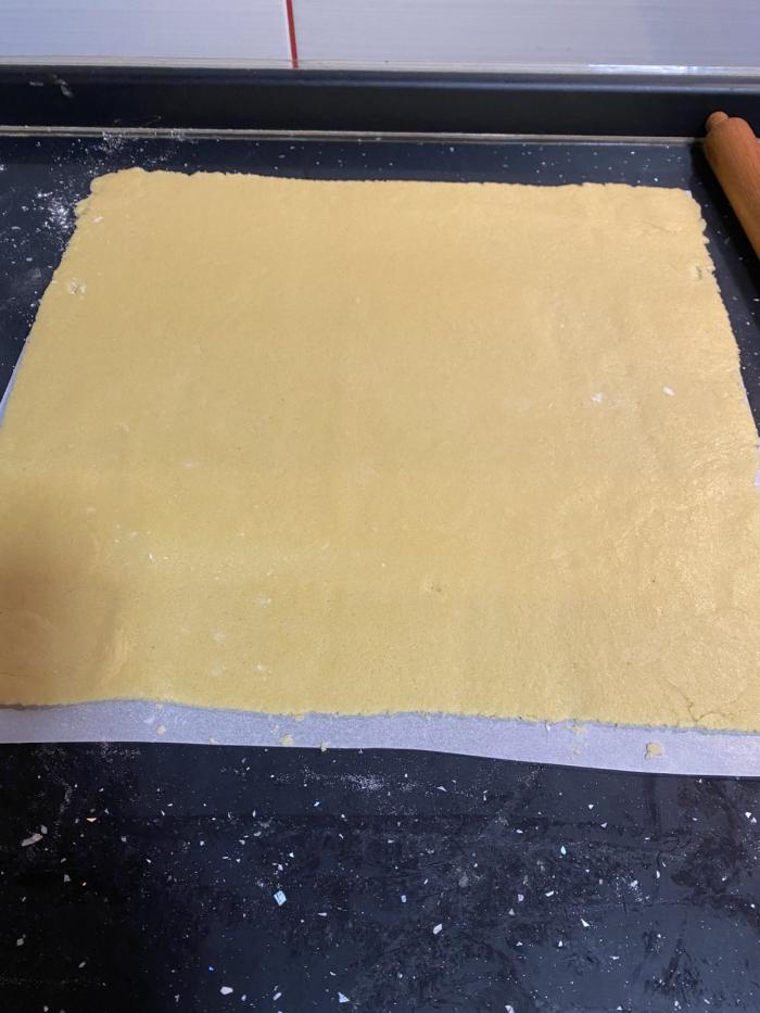 Podmažite i pobrašnite pleh dimenzija 31x33 cm. Testo stavite na papir za pečenje. Pokrijte drugim komadom papira za pečenje i malo pritisnite. Rasklagijajte testo do veličine pleha. Dok ga razvaljate, možete po potrebi ukloniti papir i zalepiti višak testa gde je potrebno. Pripremljeno testo prebacite u pleh za pečenje. Polako odlepite papir.