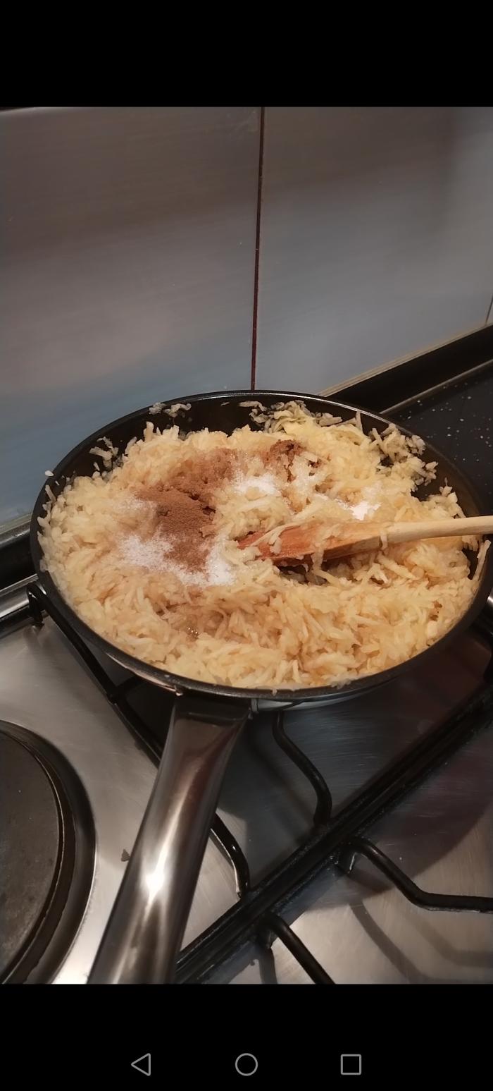 Jabuke očistite i narendajte na krupno rende. Dodajte cimet i šećer pa kratko propržite na tiganju, oko 10 minuta.