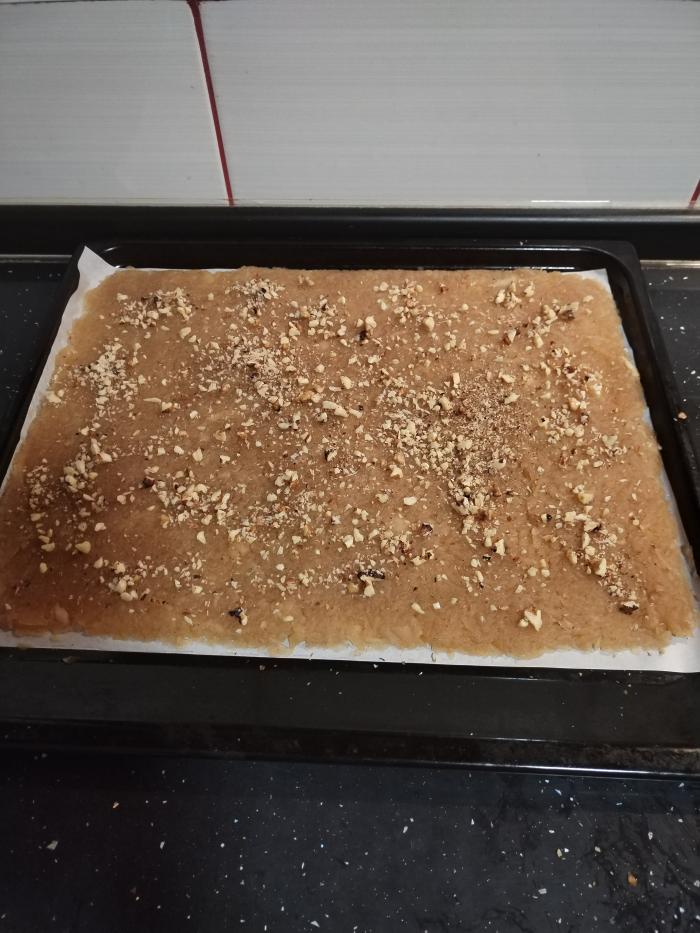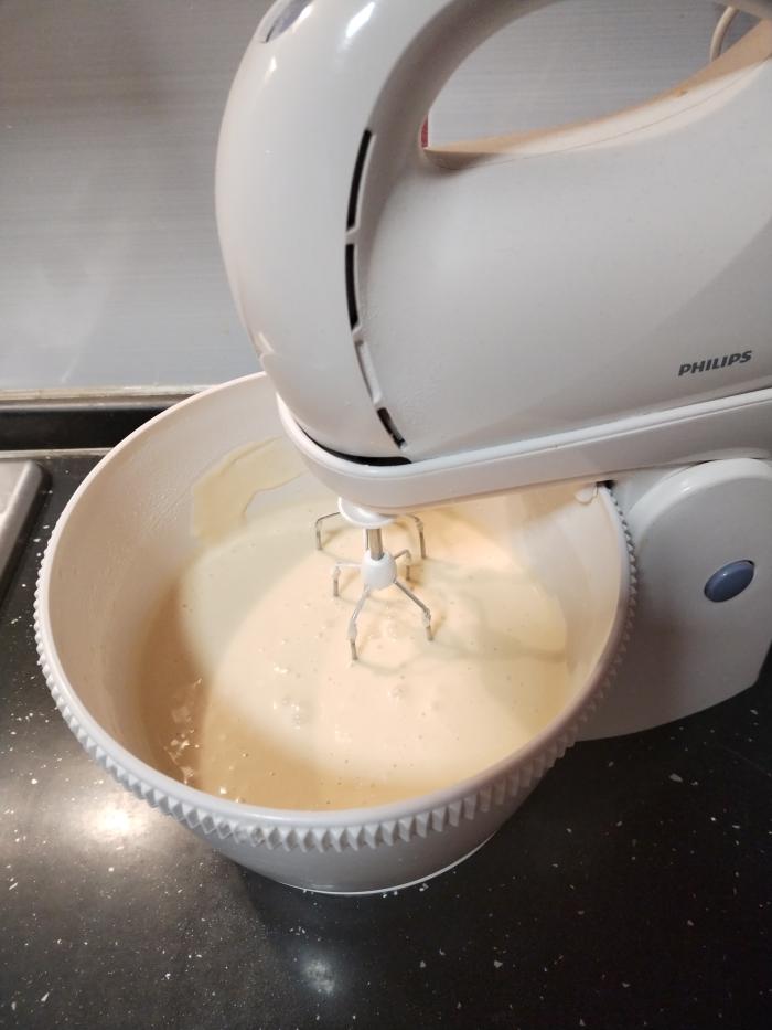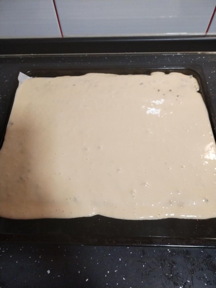 U dublji sud umutite jaja, so i šećer dok smesa ne postane svetla i penasta. U drugi sud zagrejte mleko, puter i vanilin šećer dok se puter ne otopi. U brašno dodajte prašak za pecivo i polovinu dodajte u jaja. Pažljivo izmešajte. Dodajte zatim mleko i puter, a zatim preostalo brašno i mešajte dok se sve ne sjedini.