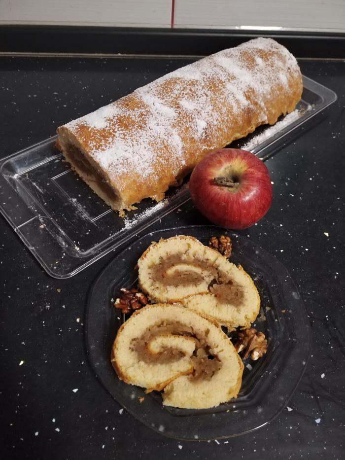Pecite u prethodno zagrejanoj rerni na 200 stepeni oko 20 minuta. Gotovu piškotu pokrite papirom za pečenje i zajedno sa plehom okrenite tako da vam jabuke budu od gore. Dok je još topla uvijte u rolat zajedno sa papirom i ostavite da se ohladi. Pospite šećerom u prahu i poslužite.