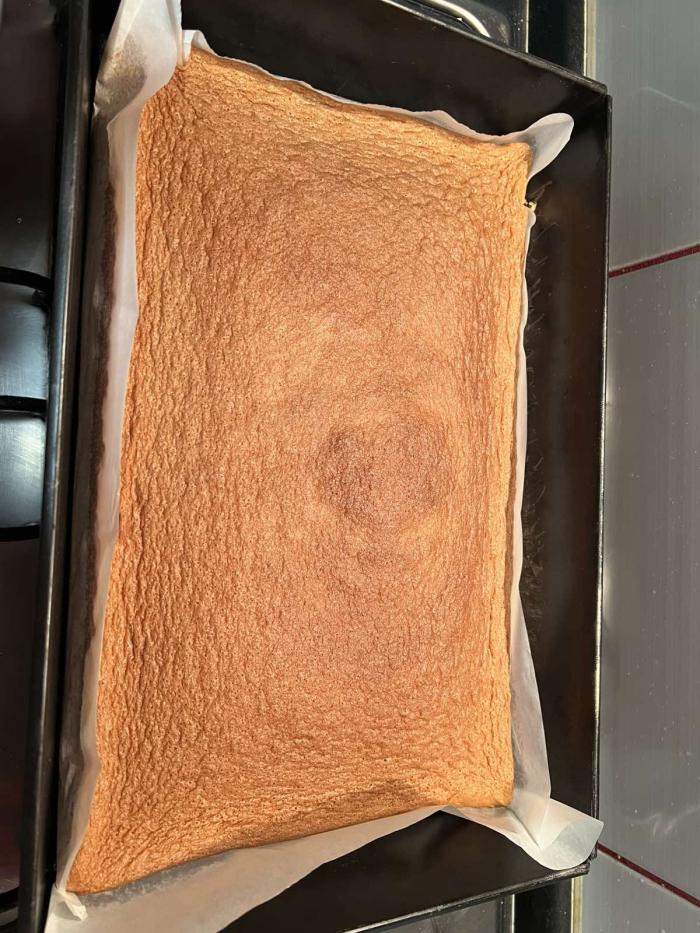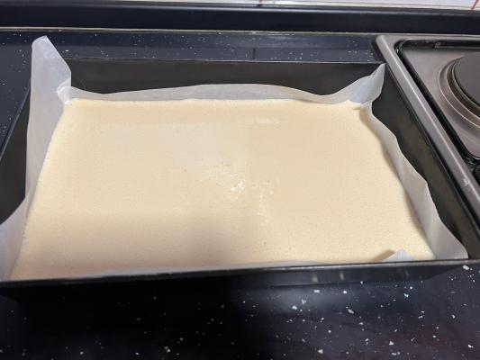 Izlijte smesu u pleh veličine 25x35 cm koji ste prethodno obložili papirom za pečenje.