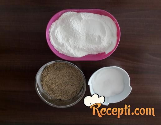U jednom sudu pomešati brašno, prašak za pecivo, vanillin šećer, šećer i mlevene orahe.