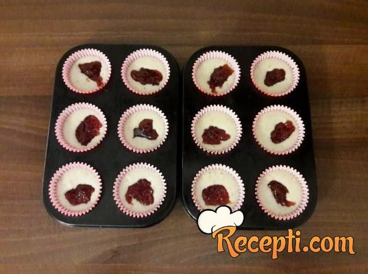 U svakoj korpici staviti po jednu kašiku džema i preko izliti preostalu smesu za mafine. Džem neće da potone već će da ostane u sredini gde ste ga stavili.