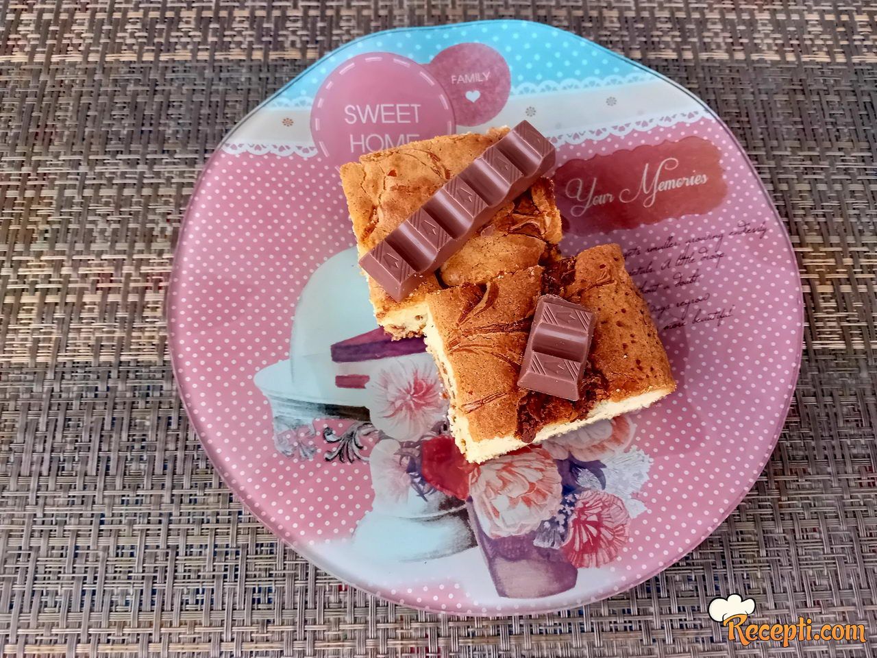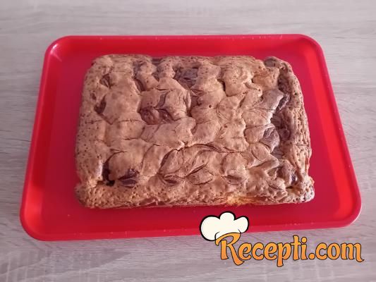 Mikserom umutiti jaja sa šećerom i vanilin šećerom, pa dodati otopljenu čokoladu i otopljen margarin, izmiksati te mikser isključiti. Dodati brašno, izmešati špatulom i uliti u pekač obložen pek-papirom.