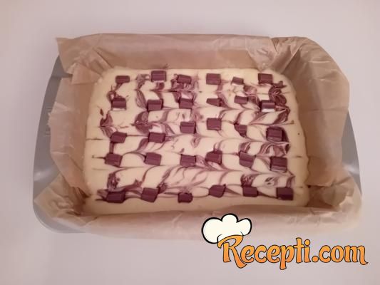 Dodati krem te čačkalicom napraviti šare. Preko rasporediti iseckane Kinder čokoladice. Peći u dobro zagrejanoj rerni na 180 stepeni 25 minuta.