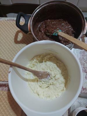 Smesu podeliti na dva dela. U jedan deo umesati kokos, a u drugi kakao i mleveni keks.