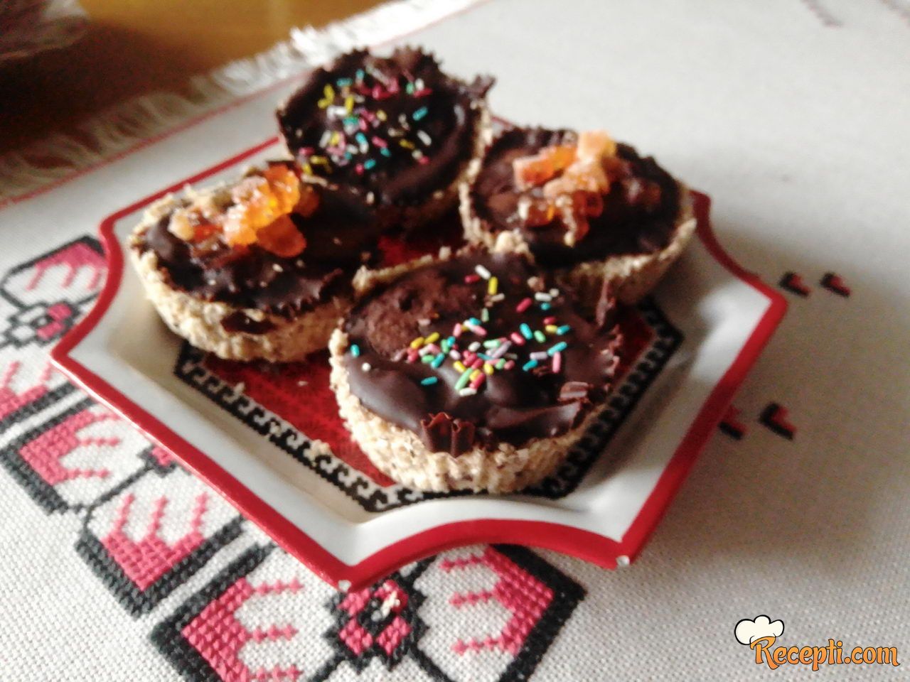 U blender staviti pahuljice, badem, kokos, cia semenke, urmei, vodu i usitniti. U kalup za mafine staviti papirne korpice i u svaku stavljati pripremljenu smesu i pritiskati sa malom čašicom. Otopiti čokoladu sa uljem i sipati u korpice i posuti sa nečim po želji.Ja sam sa seckanim žele bombonama i šarenim mrvicama.