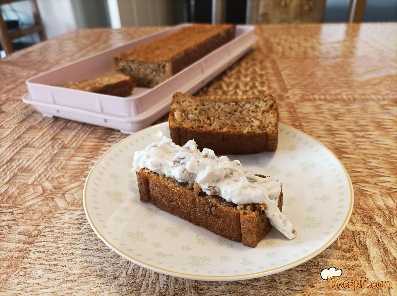 Kalup za hleb veličine 30x10x7 cm obložiti pek papirom i ostaviti ga na stranu. Jabuke oljuštiti, očistiti od semenki i iseckati na kockice. Isečene jabuke staviti u manju šerpicu, preliti ih sa limunovim sokom i promešati. Dodati 2 kašike vode i staviti da se kuvaju na tihoj temperaturi, uz povremeno mešanje. Kada jabuke omekšaju, skloniti ih sa vatre i ručnim blenderom ili seckom ih usitniti u pire. Tako pripremljene jabuke ostaviti da se ohlade. Suvo grožđe preliti toplom vodom i ostaviti 10-ak minuta, procediti ga i staviti na papirni ubrus, da papir upije višak vode. Zatim ga iseckati.