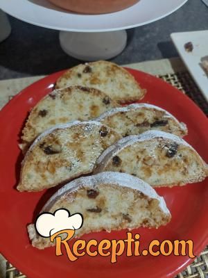 Kad je sam gotov ručno umešati ulje i brašno. To raditi naizmenično da se ne dobiju grudvice. Dodati i prašak za pecivo, rum i sušeno voće seckano.