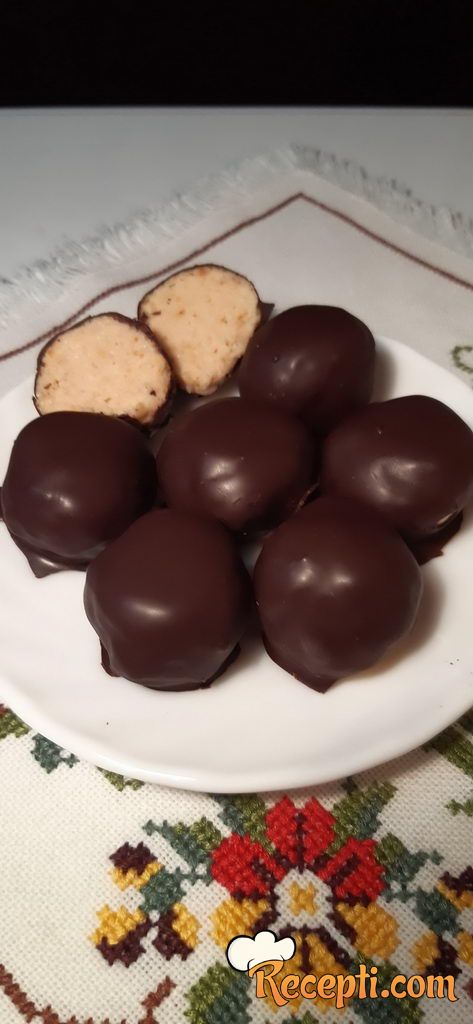 Dok se bombice hlade pripremite glazuru: otopite nalomkanu čokoladu pomešanu sa uljem na umerenoj temperaturi ili na pari. Kratko prohladite pa umačite pripremljene bombice i ređajte opet na pek papir.