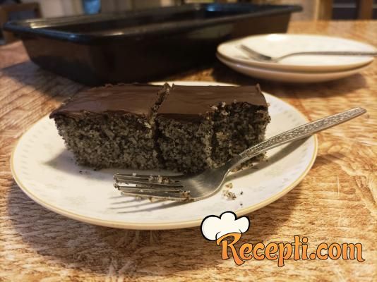 U vanglicu staviti sve suve sastojke - šećer, brašno, pšenični griz, mleveni mak (koristila sam mleveni mak bez dodataka, ako koristite mleveni mak sa dodatkom šećera, smanjite šećer u sastojcima) i prašak za pecivo. Žicom za mućenje dobro promešati da se svi sastojci sjedine. Sipati gaziranu vodu i ulje i žicom sjediniti sastojke. Testo izručiti u pripremljeni pleh, poravnati površinu i staviti da se peče 20 minuta. Pečeni kolač ostaviti da se prohladi dok se istopi čokolada.