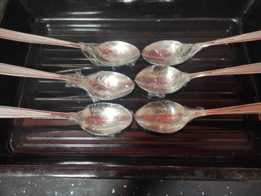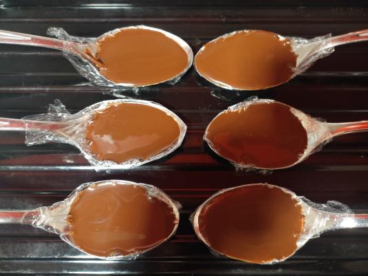 Rastopite mlečnu/crnu čokoladu i ostavite je da se ohladi kako ne bi curila. U svaku kašiku sipajte rastopljenu čokoladu, pa je lagano protresite da se površina čokolade u kašikama poravna. Napunjene kašike stavite pažljivo na pripremljen papir za pečenje, tako da vam drška stoji na rubu tepsije.
