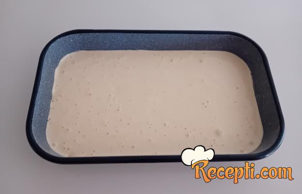 Mikserom umutiti jaja sa šećerom. Zatim dodati ulje i mleko te izmešati ručnom žicom. Dodati brašno, prašak za pecivo i izmešati ručnom žicom kako bi se svi sastojci sjedinili. Smesu usuti u uljem podmazan i brašnom posut pleh. Peći u dobro zagrejanoj rerni na 180 stepeni desetak minuta.