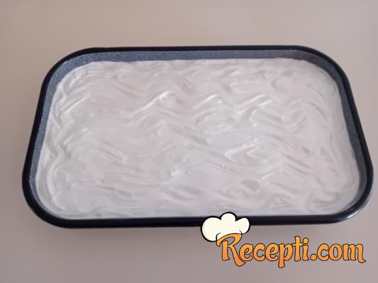 Beli deo: Sjediniti belanca, šećer, limunov sok, vanilin šećer, blago izmešati ručnom žicom te zagrejati na pari 10 minuta, uz mešanje. Zatim skloniti sa vatre i mikserom umutiti u čvrst sneg te naneti preko biskvita.