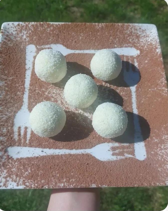 Za kokos sam napisala oko 100 g, vi procenite, ako vam je mekano, dodati još po potrebi da mogu da se ptave kuglice.