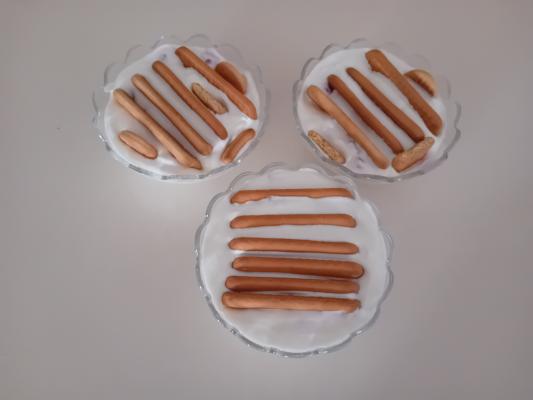 U 3 činije stavite po 2 kašike grčkog jogurta. Preko poređajte voće, pa rasporedite preostali jogurt. Zatim poređajte keks i blago utisnite u smesu. Prekrijte providnom prijanjajućom folijom i ostavite da odstoji u frižideru minimum 5 sati (najbolje je da prenoći u frižideru).