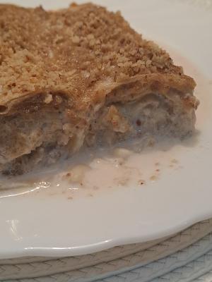 Pomešati zagrejano mleko, slatku pavlaku i kašiku šećera, pa preliti preko palačinki. Ostaviti pola sata da upiju, pa posuti mlevenim orasima po želji (još dve kašike) i zapeći oko 25 minuta na 180 stepeni.