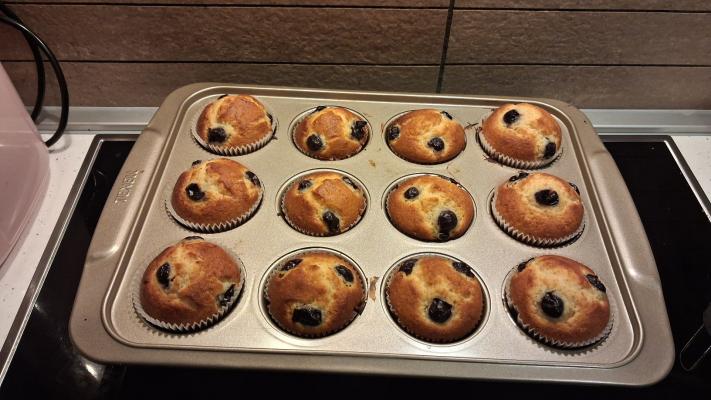 Dodati mešavinu za mafine iz pakovanja, i sve dobro umutiti. Sipati u kalup za mafine u koji ste prethodno stavili papirnate kapice. Masu rasporediti ravnomerno u svih 12 kapica. Od višanja odvojiti 12 komada za dekoraciju, a ostale zabadati u testo.