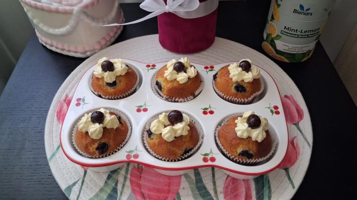 Dekorisati mafine šlagom i višnjama. Prijatno!