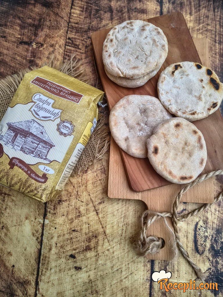 Umesti mekano testo, pokrti i ostavi da naraste oko 40 minuta. Kada testo naraste, kidati male loptice i rukama ili oklagijom oblikovati pogačice debljine 1 cm. Ugrejarti plotnu ili tiganj bez ulja, pa peći pogačice sa obe strane dok ne porumene i zamirišu.